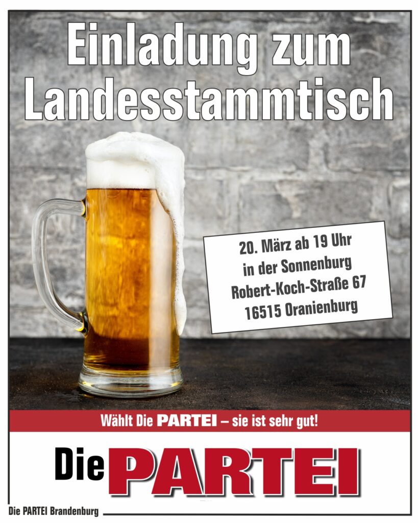 Im Beisein des größten Vorsitzenden aller Zeiten (GröVaZ) (Martin Sonneborn) der Partei Die PARTEI (als Pappaufsteller) wurde am 11.10.2025 im Parkclub in Fürstenwalde der neue und beste Vorstand des Landesverbands Brandenburg gewählt.
